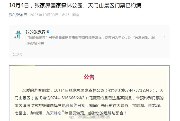 10月3日下午,湖南张家界发布公告称,张家界国家森林公园、天门山景区10月4日门票预约已达上限,建议游客调整行程或选择其他景区游览。