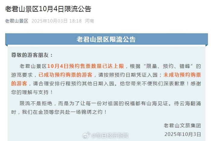 河南老君山景区公告,10月4日预约售票数量已达上限。