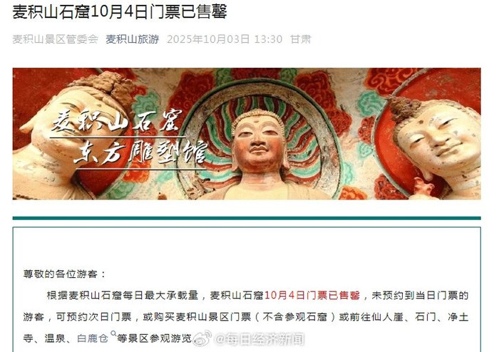 [#多个知名景区10月4日门票已售罄#]10月3日,甘肃天水麦积山大景区管委会发布公告称,根据麦积山石窟每日最大承载量,麦积山石窟10月4日门票已售罄,未预约到当日门票的游客,可预约次日门票。