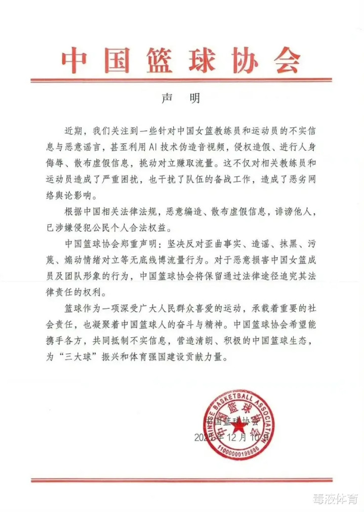 对此,中国篮球协会近日正式发布声明,对这类恶意造谣,尤其是利用技术手段伪造并传播侵权内容的行为予以严厉批评。声明指出,这些不实信息不仅干扰了运动员和教练的个人生活,也对队伍训练备战造成了影响,产生了负面的舆论效应。篮协明确表示,绝不纵容任何通过捏造事实、煽动对立来获取流量的行为。